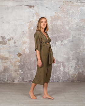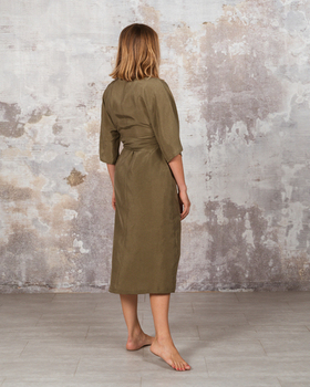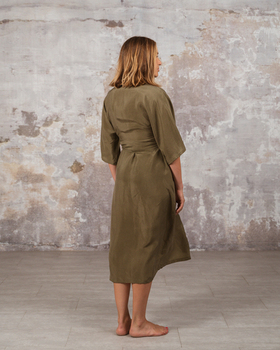Vestido midi con manga de corte japones, por delante tiene cuello en escote V, y una abertura frontal en la falda. En el centro delantero tiene unos lazos para anudar al gusto, atado a la espalda, dando la vuelta a la cintura y atándolo delante con una lazada…Se abrocha en el lateral con una cremallera invisible. Confeccionado en cupro en color khaki y con estampado tie dye que se realiza uno a uno, por lo que nunca habrá dos vestidos estampados iguales, aunque nos parece que eso es lo que las hace únicas y mas especiales.