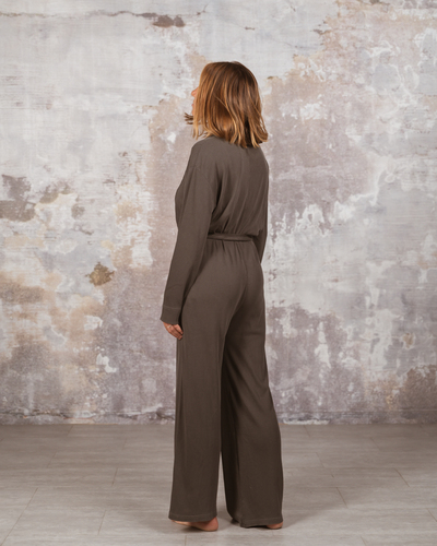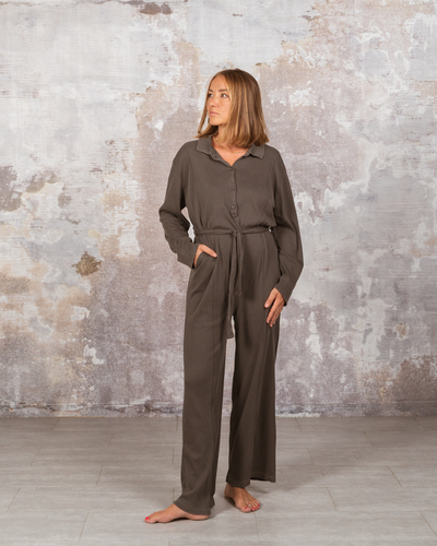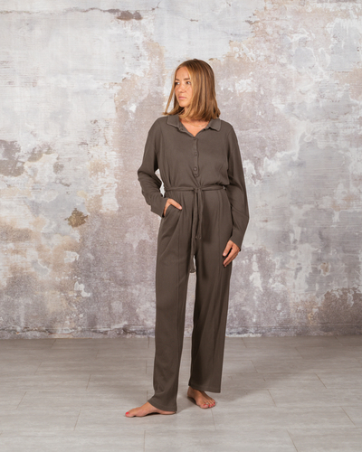 Mono largo con cuello polo y botones en delantero, cinturón para anudar al gusto. Disponible en color gris y khaki. Los tintes son naturales en todas nuestras colecciones lo cual puede generar variaciones en el color de la prenda.