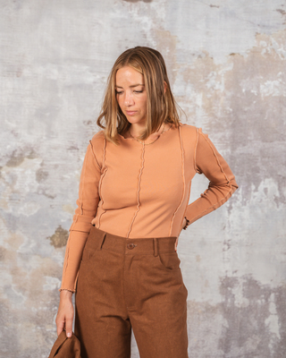 Top de manga larga en algodón orgánico, con costuras en overlock vistas. Disponible en teja, en lila, y khaki. Los tintes son naturales en todas nuestras colecciones lo cual puede generar variaciones en el color de la prenda.